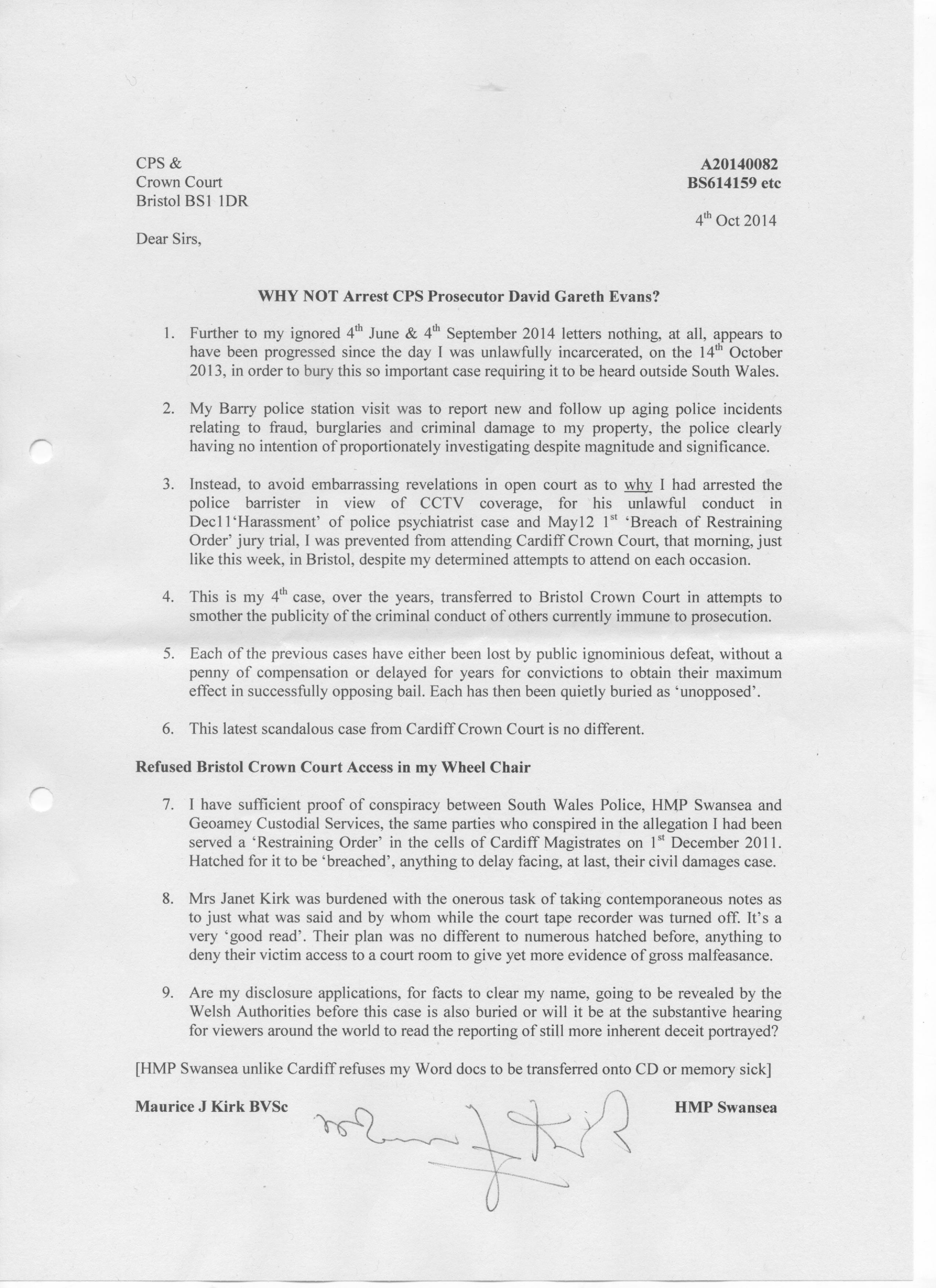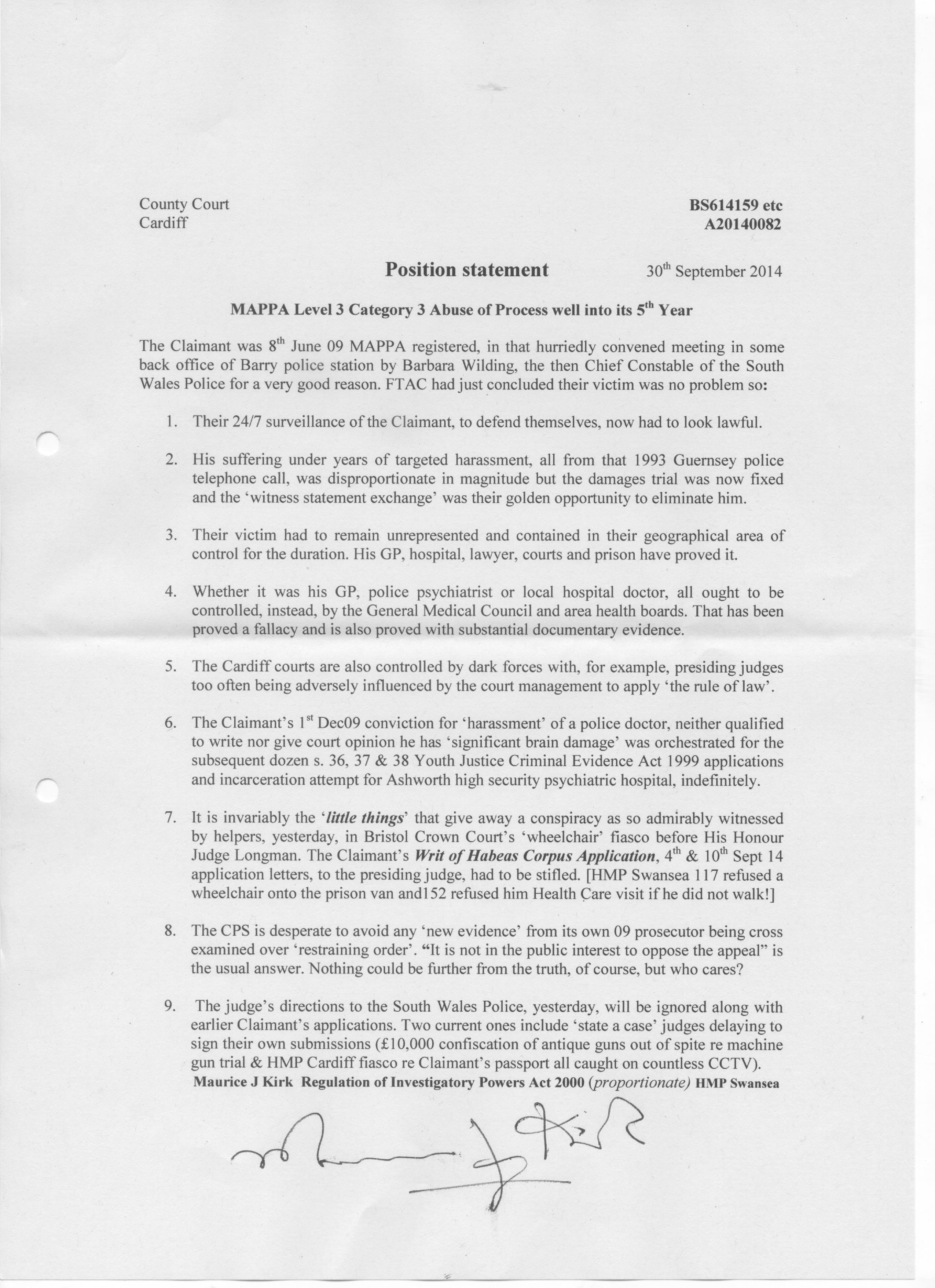 The Great Wheelchair Conspiracy – how there couldn’t possibly be collaboration between HMP Swansea and HMCS Bristol to get a prisoner into court… - Position Statements of 29 Sept: a chronology of events since July 2009 of Abuse of Process to prevent Maurice from progressing his case