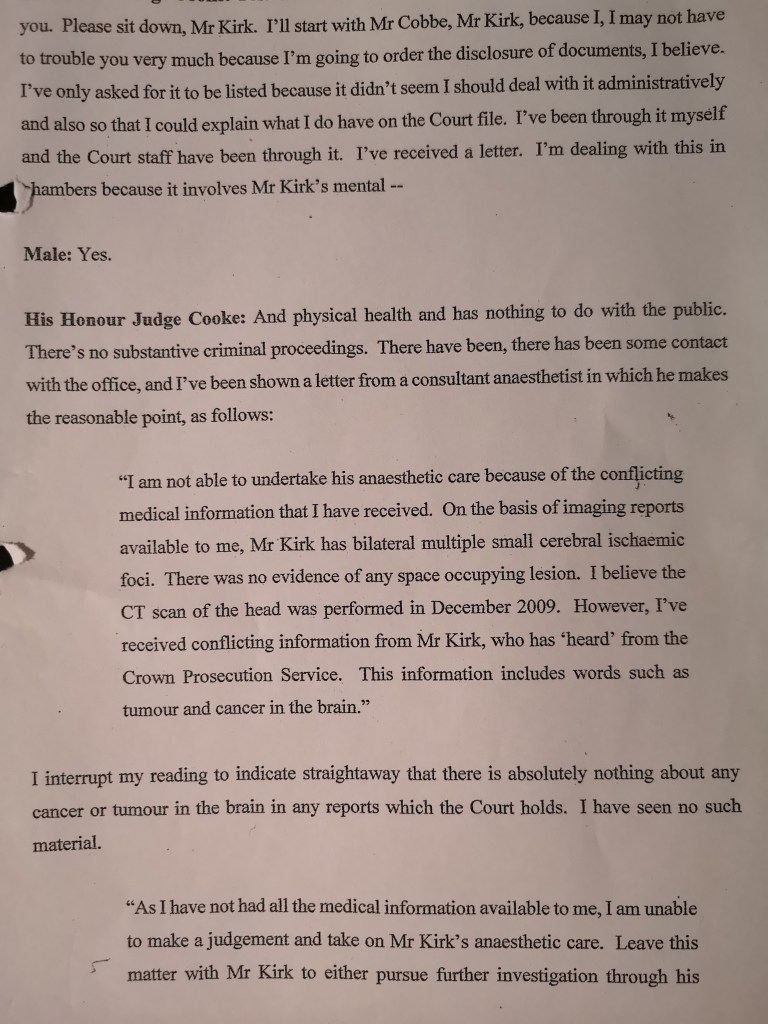However, the CPS, without the judge knowing, had secretly informed an earlier closed hearing, in my forced absence, that I had possible cancer and in no way was it in the interest of their victim of 50 odd failed criminal convictions to be told.