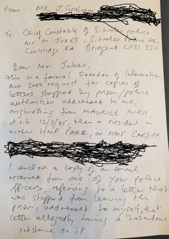 My FOIA requests asks for a copy of this letter – as it obviously exists as Mr. Kirk was charged with attempting to send the said letter to myself – along any other letters pertaining to myself that were not sent to me from either HMP Parc or HMP Cardiff during the times Mr. Kirk was resident in either of these prisons.