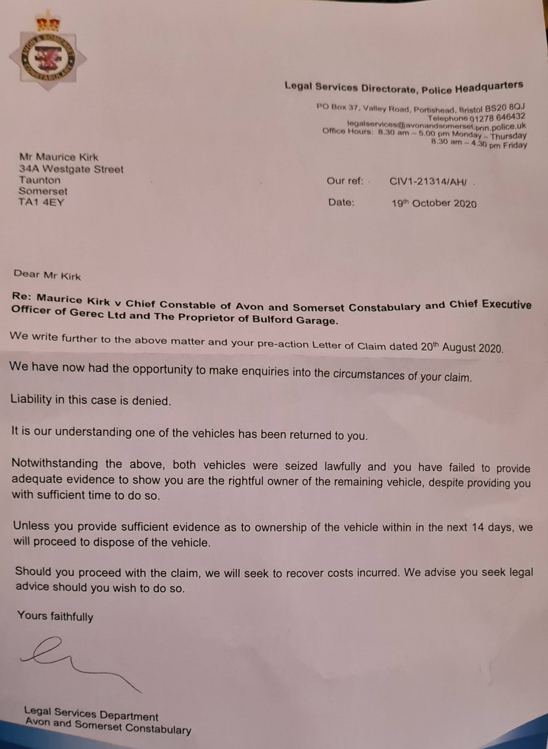 Meantime, my Taunton County Court will be busy over the remaining car also, of course , was stuffed with my 1CF03361 One million pound ‘trading in machine guns’ claim, following yet another South Wales Police failed malicious prosecutions