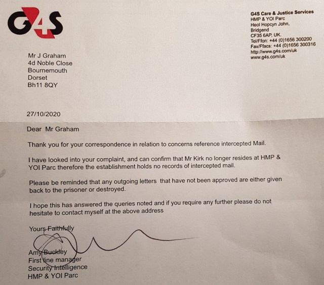 1) G4S run HMP Parc, Bridgend, has again confirmed my letters to you from that prison, during during 2009 and 2020, were either stamped, following HM approval and sent on to you or they were destroyed.