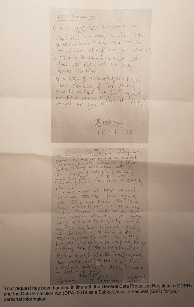 But I wrote to Mr Graham’s MP, Mr Burn, in Bournemouth from my welsh prison about the South Wales Police bullying but the prison staff stopped some of those letters as well. I ask you, HM Prosecutor, for copy of them, along with John Graham’s letter from me, as is my right under CPR.