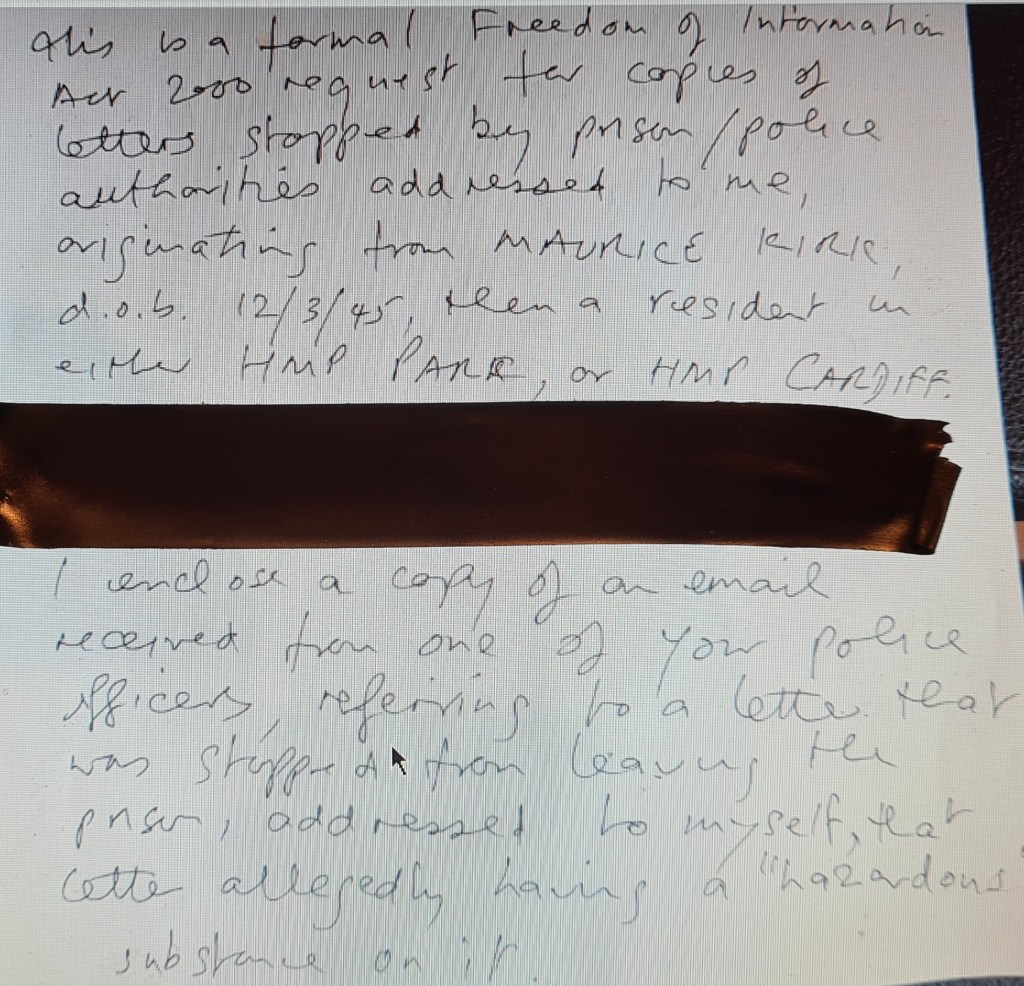These letters and the ones of mine to others, the South Wales Police have confiscated including those of mine to John Graham Esq I was gaoled for many months for the purported content of JG’s letter and the welsh authorities, of course, refuse either of us now to have a copy of any of them despite using their content to have me brutally incarcerated by fabricating I had a conviction for ‘child abuse’!