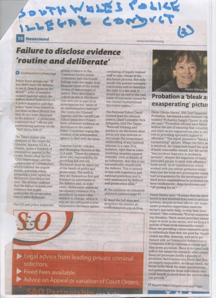 The Times, Centre for Criminal Appeals (CCA)’s, Cardiff Law School’s ‘Innocence’ project, Crown Prosecution Service Inspectorate’s & Inspectorate of Constabulary’s dossiers, re ‘police disclosure evidence’, were all submitted to London’s HM Justice Select Committee