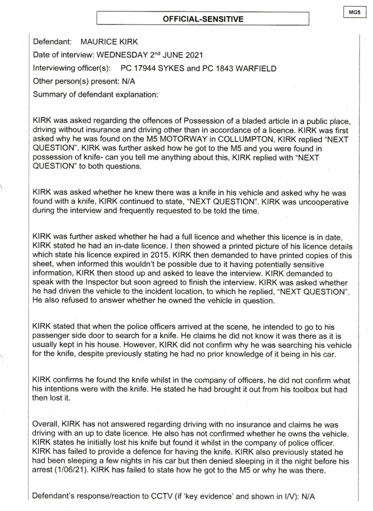 - Such is the level of spite as of 2nd June I now face charges including ‘being in possession of a kitchen knife on the M5 motorway’ contrary to section139(1) and (6) of the Criminal Justice Act 1988 and driving ‘without appropriate driving licence’ or Insurance cover’!