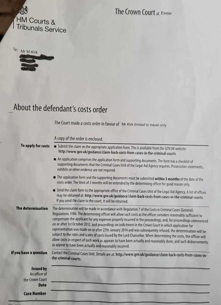 I must have a fully filled in costs order, please, for the RCJ’s MoJ department or it will reject it and especially as the latest farce in Exeter magistrates court yesterday appears to be a repeat performance and heading down the same route.